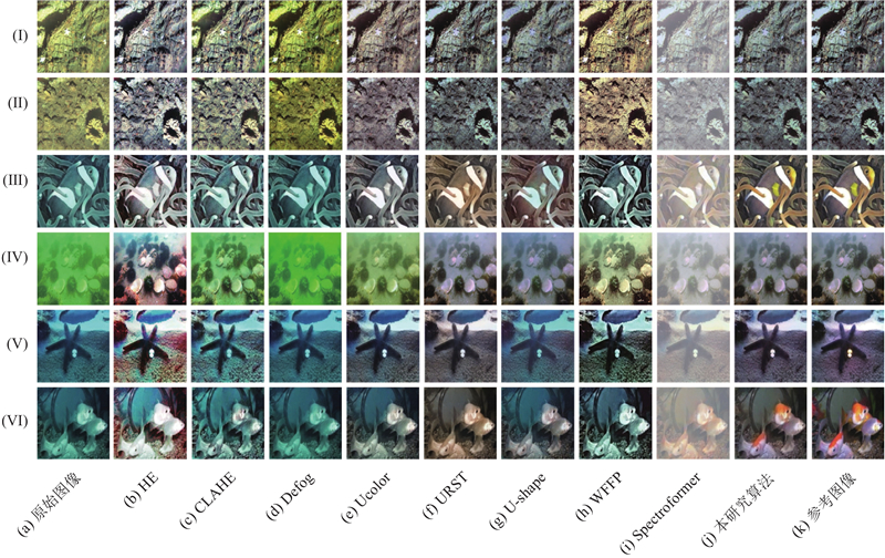 Tab.2 算法 MSE↓ PSNR↑ SSIM↑ Entropy UIQM↑ UCIQE↑ 原始图像 1751.358 17.253 0.754 6.894 3.967 0.539 HE[7 ] 1868.491 16.621 0.737 7.167 4.294 0.664 CLAHE[8 ] 1216.226 18.194 0.713 7.319 4.424 0.567 DEFOG[6 ] 2730.896 15.243 0.709 6.841 4.231 0.553 Ucolor[25 ] 868.585 20.151 0.748 7.368 4.211 0.608 URST[26 ] 864.725 20.178 0.769 7.415 4.359 0.584 U-Shape[18 ] 734.626 20.881 0.709 7.262 4.397 0.578 WFFP[27 ] 828.485 18.949 0.791 7.749 4.213 0.609 Spectroformer[28 ] 1546.455 16.235 0.684 6.552 3.723 0.521 本研究算法 438.480 21.711 0.792 7.301 4.443 0.579