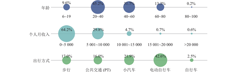 在出行方式方面,本研究涵盖的交通方式被分类为:步行、公共交通(PT,包括地铁和公交车)、小汽车、电动自行车和自行车5类,由图1可以看到,电动自行车占据了极高的比例,达到了42.6%,远超其他交通方式,成为居民出行的首选. 其次是小汽车(21.9%)出行方式,而公共交通(PT,16.0%)和步行(17.0%)的占比相当. 自行车占比最低,仅占2.5%.