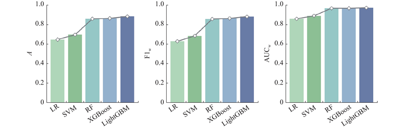 对于居民出行方式选择的预测是一个多分类问题,在多分类任务中,模型性能的评估通常选用准确率A、精确率P、召回率R和F1分数F1,准确率反映了模型对样本分类的正确率,精确率反映了模型对正例样本的识别能力,召回率反映了模型对正例样本的覆盖能力,F1分数是精确率和召回率的调和平均数. 由于F1模型常用于综合评价分类问题,本研究选用准确率A和加权F1分数F1w作为评估指标,除此之外,进一步选取反映模型判别能力的加权AUC(area under ROC curve)AUCw作为全局性能指标,AUCw取值范围为0.5~1.0,越接近1.0表明模型性能越好,越能完美地区分正负类. 全局指标计算公式如下: