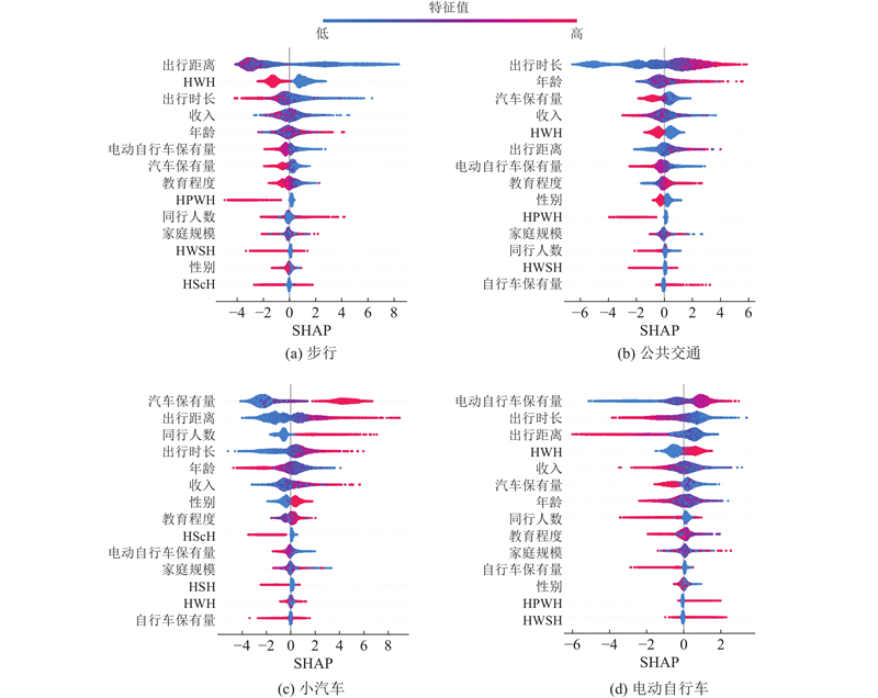为了深入分析居民个人出行决策的影响因素,研究居民单日活动链和个人属性对于出行方式选择的影响,采用Lundberg等[28]提出的SHAP理论进行分析,并对LightGBM模型中的特征重要性排序,SHAP的绝对值大小表示特征对模型结果的影响程度,正和负分别代表对模型结果产生的正向和负向影响. 其影响因素分析结果如图6所示. 图6是针对不同出行方式预测的SHAP值汇总图. 图中特征按重要性从上至下排序. 横轴SHAP值衡量特征对预测概率的贡献:正值表示正向促进,负值表示负向抑制. 点的颜色代表特征值大小(红色代表特征高值,蓝色代表特征低值). 例如在图6(a)第1行中,出行距离呈“蓝右红左”分布,表明低出行距离对于步行选择呈现为正向促进作用. 经图1数据显示,自行车出行的比例仅占2.5%,而电动自行车则占比42.6%,因此,本研究将研究重点聚焦于公共交通和电动自行车,对于自行车出行则不做深入分析.