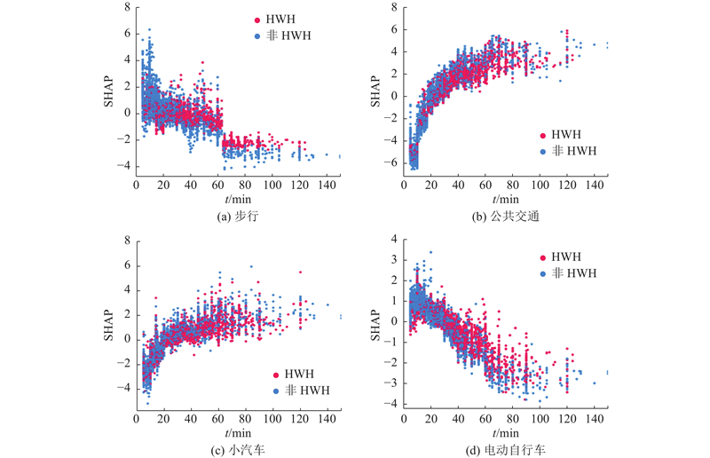 如图8(d)所示,对于电动自行车,其选择概率(SHAP 值)普遍随着出行时长的增加而递减,当出行时长超过20 min时,电动自行车的吸引力已显著下降;当出行时长超过40 min时,电动自行车对所有群体都基本不再是优选方案. 值得注意的是,在同等出行时长条件下,HWH群体对电动自行车的偏好始终高于非HWH群体,这可能反映了电动自行车在特定时间窗口内的独特优势. 对于日常通勤群体(HWH)而言,电动自行车提供的点对点出行能力、相对可控的行程时间(相比公共交通的等待和延误风险),以及相比步行的速度优势,可能完美契合了通勤活动对时间和效率的要求,但在出行时长高于40 min时则会因效率不再占优而迅速被放弃.