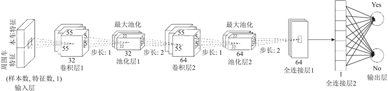 考虑到面向未来复杂交通场景下的车辆换道预测研究,所选用的模型须满足高维数据输入、训练及计算方便快速的要求,故选用擅长处理复杂数据关系和高维数据的长短时记忆网络(long short-term memory,LSTM)、双层卷积神经网络(double layer convolutional neural network,2-CNN)建立换道预测模型.