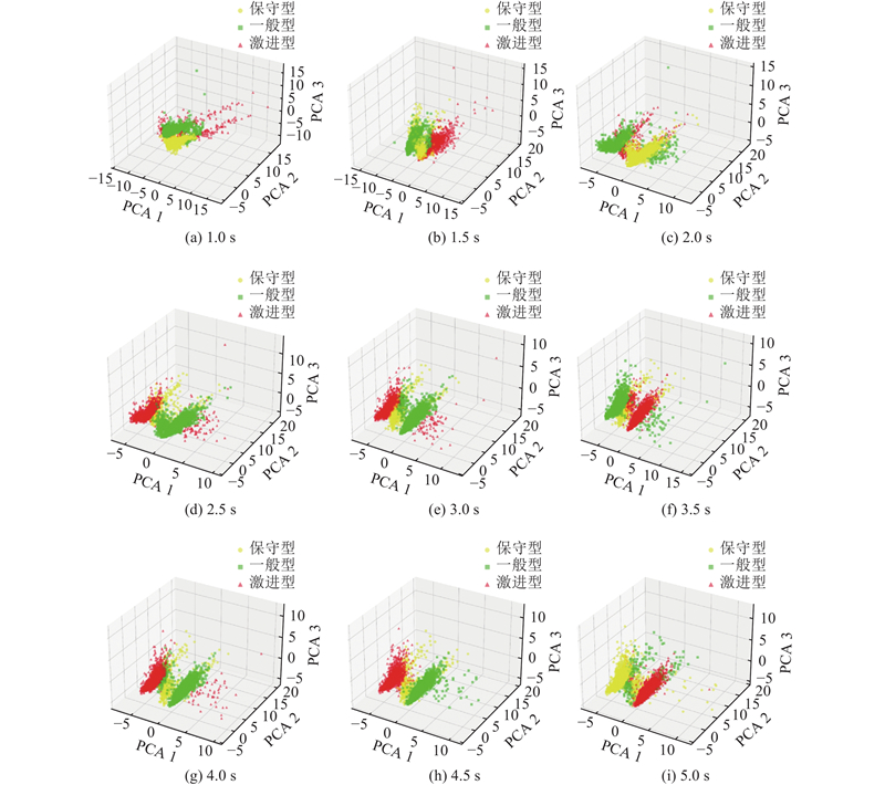 如表3所示为不同窗口时间下驾驶风格聚类有效性评价指标. 可以看出,所有窗口时间下的轮廓系数均大于0.5,Calinski-Harabasz指数均高于2 000,Davies-Bouldin指数均小于1,均满足聚类有效性的常用标准,说明聚类结果具有较好的分群效果. 整体来看,本研究采用的PCA+K-means方法能够有效区分不同驾驶风格,聚类分组具有较高的可信度和实际意义.