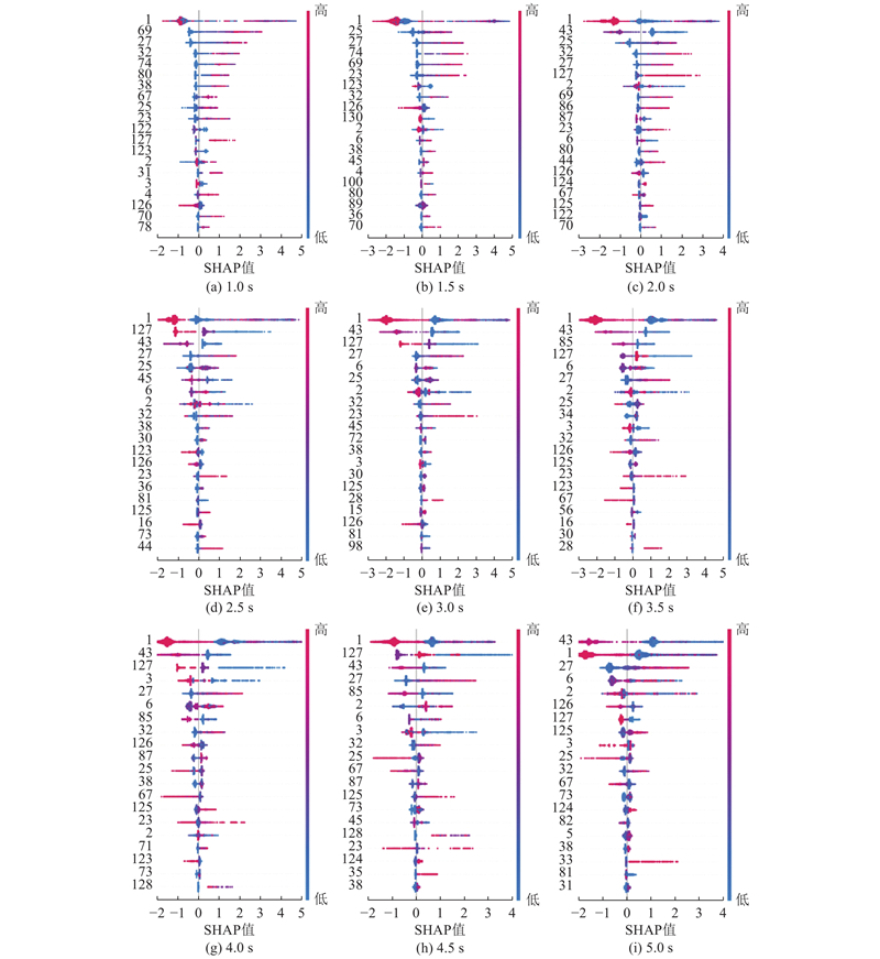 对每个窗口期内所有特征的SHAP值进行汇总与可视化,生成特征重要性图(见图9),直观地展示了整体模型中影响力最大的前20个特征,并按影响力从高到低依次排列. 其中,纵坐标代表特征变量序号,红色说明该特征的取值较大,蓝色说明该特征的取值较小,横坐标的SHAP值表示该特征对换道预测结果的影响程度与正负方向. 通过比较每个时间窗口期的SHAP值分析结果可以看出,本研究新增的特征变量,包括127(换道车辆的驾驶风格)、130(目标车道后车的驾驶风格)、123(目标车道前车长度)、126(货车在车流中的比例)、125(交通流的密度)、128(前车驾驶风格)、122(前车车长)等这些特征变量的影响排名较前,说明新增的特征变量对换道行为预测的影响较大,将其引入有助于提升模型预测的准确性.