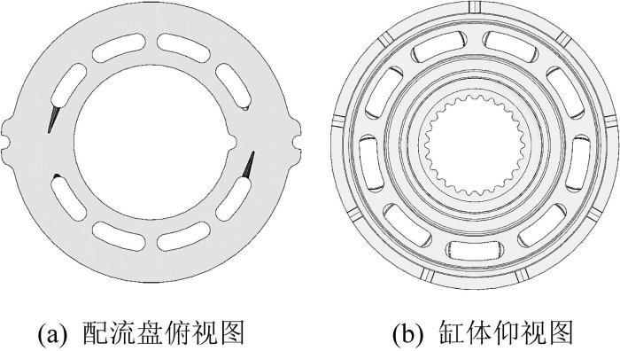 配流盘与缸体组成一对摩擦副,其配合面结构如图2所示。其中配流盘为对称结构,在其预升压/泄压区域开设阻尼槽,配流窗口之间均附有加强筋,以保证配流盘结构的可靠性。