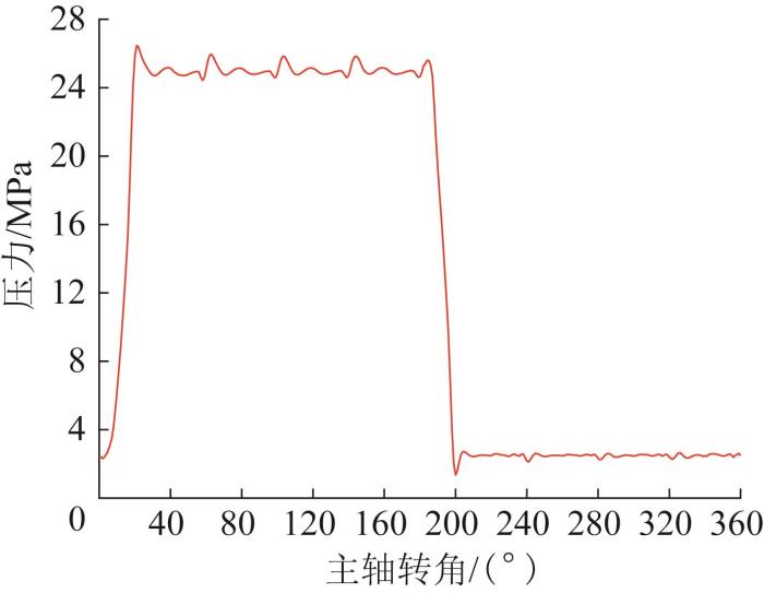 在1个转动周期内,在预升压和预泄压过渡阶段,孔内压力均存在超调量:在预升压区域,孔内压力存在正超调量,约为1.38 MPa;在预泄压区域,孔内压力存在负超调量,约为1.15 MPa。在排油侧和吸油侧,孔内压力每隔20°就会产生一次冲击。这是因为该柱塞泵有9个柱塞,在柱塞泵旋转过程中,缸体每转过20°就有一个柱塞位于外死点处,每转过40°就会有一个柱塞位于内死点处,孔内压力的正、负超调量传递到其他柱塞孔,形成了高、低压区域交替出现的特点。柱塞泵单个柱塞孔压力曲线如图7所示。