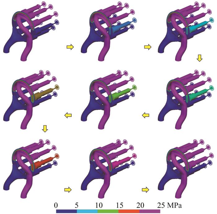 柱塞泵预升压区域的压力变化云图如图8所示。由图可知,处于预升压阶段的柱塞大致经历9个阶段。从低压吸油区转至预升压区域时,柱塞孔内部进入从阻尼槽倒灌的高压油液,其经过压缩容腔致使孔内压力逐渐升高;当柱塞孔内的压力升高至与排油侧相同时,整个升压过程完成。但由于压差的存在,阻尼槽处的倒灌油液具有较高流速,相当于高速射流。对于预泄压过程,其流场域特性与预升压过程相反。