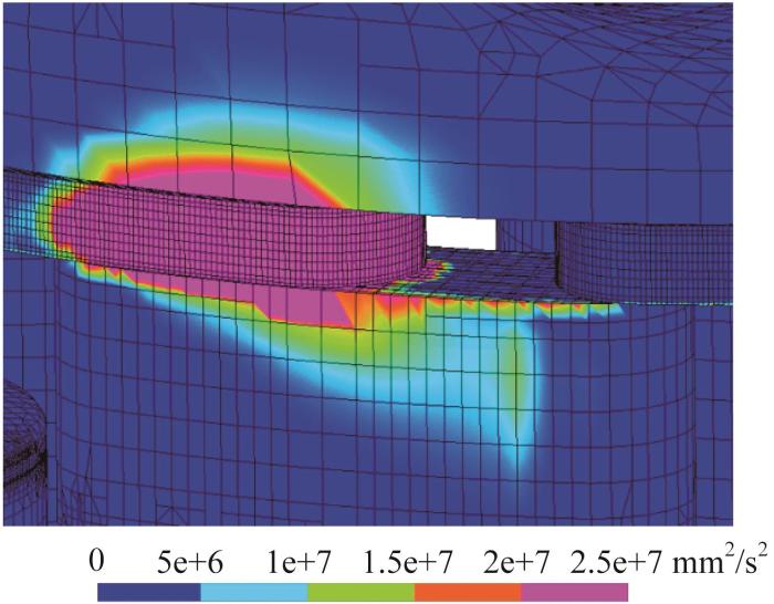 配流盘加强筋处湍动能云图(主轴旋转21°)