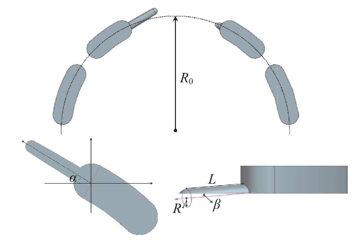 圆柱形阻尼槽的关键结构参数包括阻尼槽半径R、阻尼槽长度L、阻尼槽错配角α、分布圆半径R0和倾覆角β,如图12所示。过流面积M可以表示为与上述5个参数相关的分段函数,而柱塞泵出口压力-流量脉动特性均与M有关。因此,针对柱塞泵出口压力-流量脉动特性的优化,可以通过优化阻尼槽结构进行。