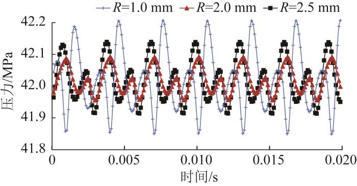 不同阻尼槽半径下轴向柱塞泵出口压力曲线