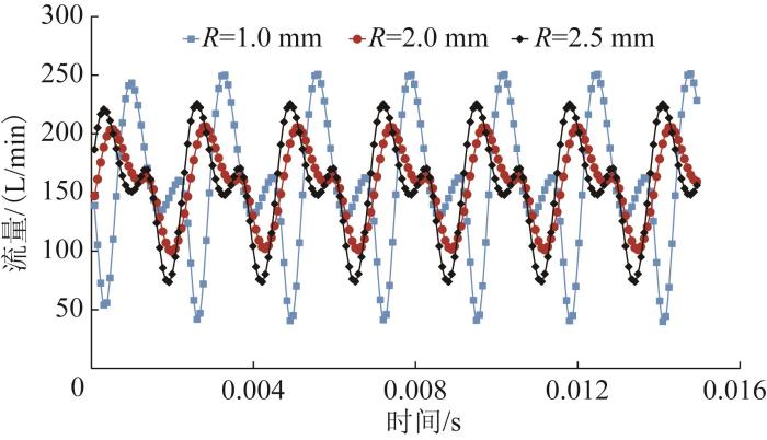 不同阻尼槽半径下柱塞泵出口流量曲线如图15所示。由图可知:柱塞泵出口流量曲线与压力曲线一致,呈现2个峰值波动;当R=2.0 mm和R=2.5 mm时,脉动率较小。