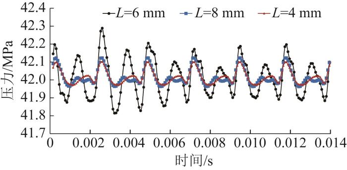 不同阻尼槽长度下柱塞泵出口压力曲线如图16所示。由图可知,当L>6 mm(即柱塞孔在任意位置均不会存在封闭容腔)时,柱塞泵出口压力特性的相似度较高。阻尼槽长度不能小于6 mm。