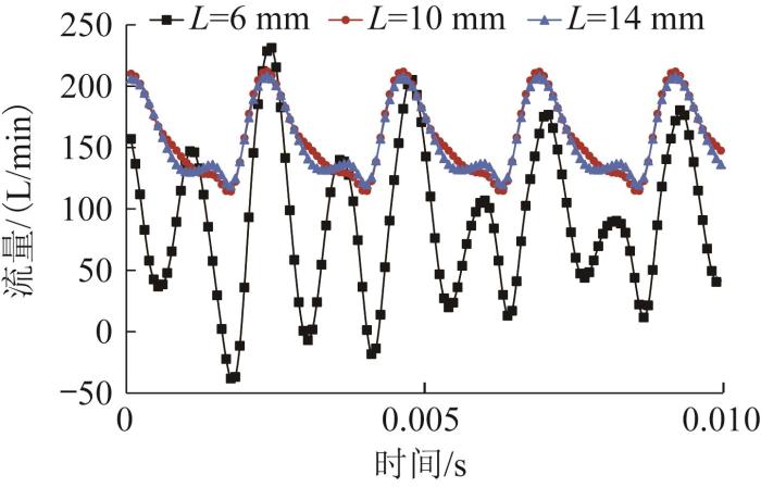 不同阻尼槽长度下柱塞泵出口流量曲线如图17所示。由图可知,柱塞泵出口流量脉动特性与压力脉动特性呈现极高的相关性,当L>6 mm时,出口流量脉动率较小。