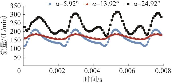 不同阻尼槽错配角下柱塞泵出口流量曲线如图18所示。由图可知,当α=13.92°时,流量脉动最小。