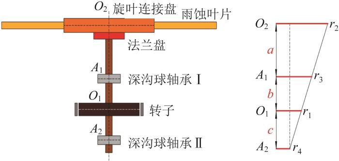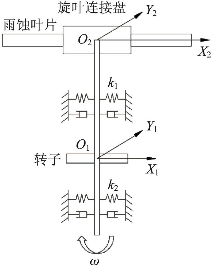转子-雨蚀叶片系统是高速耐雨蚀测试装置中的主要运行系统。该系统主要包括雨蚀叶片、旋叶连接盘、转子、深沟球轴承Ⅰ和深沟球轴承Ⅱ等零部件。基于集中质量法,构建转子-雨蚀叶片系统的振动模型,如图1 所示。其中:坐标系O 1 -X 1 Y 1 的原点位于转子形心处,坐标系O 2 -X 2 Y 2 的原点位于旋叶连接盘形心处。考虑到雨蚀叶片振动、旋叶连接盘质量偏心及转子不平衡磁拉力等外部激励对转子-雨蚀叶片系统振动特性的影响较为复杂,仅考虑系统的横向振动。