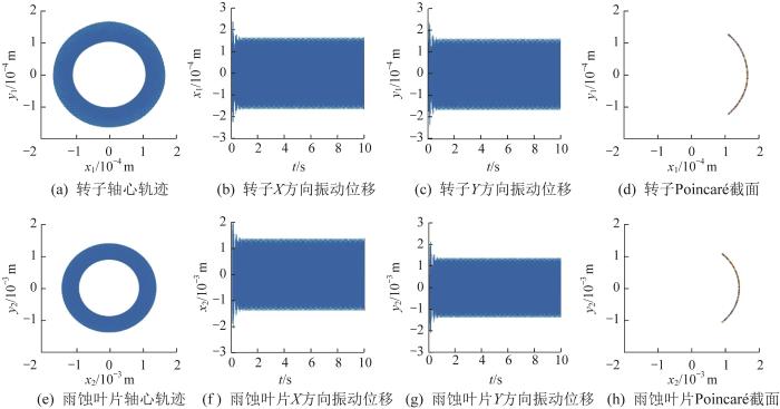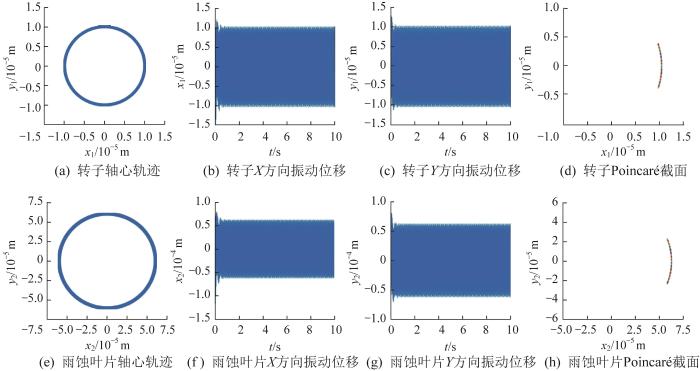... 为研究转子-雨蚀叶片系统的振动特性,选取最小工作角速度(ω =150 rad/s)与最大工作角速度(ω =350 rad/s)两种工况,基于表1 所示参数,利用四阶Runge-Kutta算法对转子-雨蚀叶片系统的运动微分方程进行数值求解,得到转子和雨蚀叶片的轴心轨迹、振动位移时域图和Poincaré截面[18 ] ,分别如图3 和图4 所示. ...