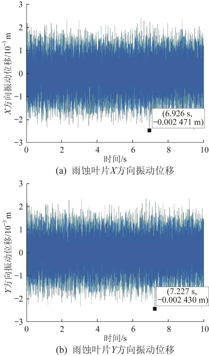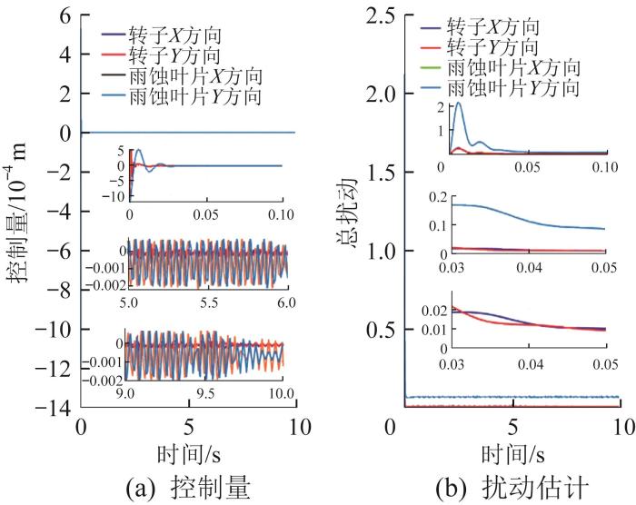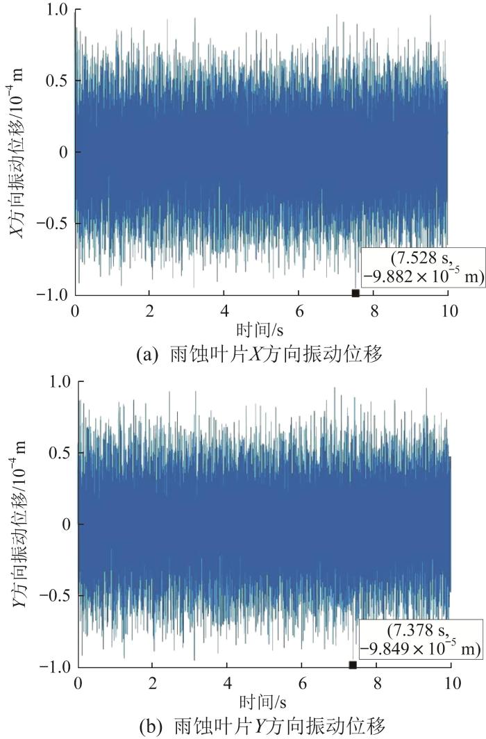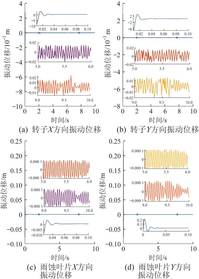 取采样步长h = 0.01 s,ESO带宽频率w o = 33 H z ,误差反馈增益κ 1 = 25 ,κ 3 = 10 ;扰动信号为转子-雨蚀叶片系统动力学方程中的偏心距和不平衡磁拉力。基于表1 所示参数,对采用自抗扰解耦控制的转子-雨蚀叶片系统的振动特性进行仿真分析,以验证所采用控制方法的可行性。自抗扰解耦控制下转子-雨蚀叶片系统的振动位移如图7 所示。