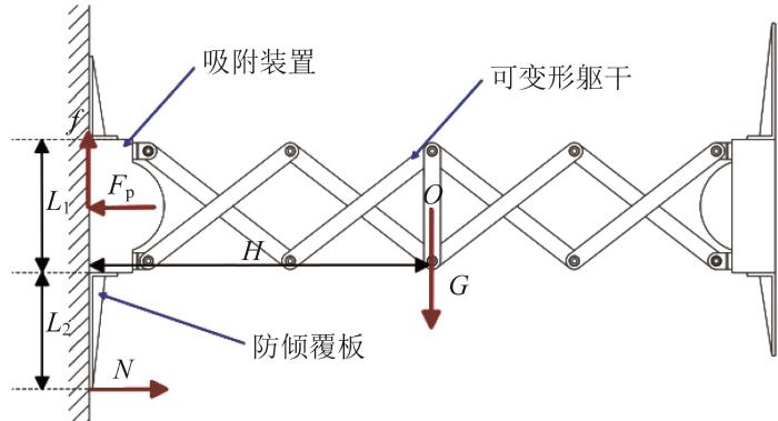 机器人可变形躯干拉伸至极限长度时,对吸附装置的受力最大。墙面上机器人极限位姿受力分析如图2所示。