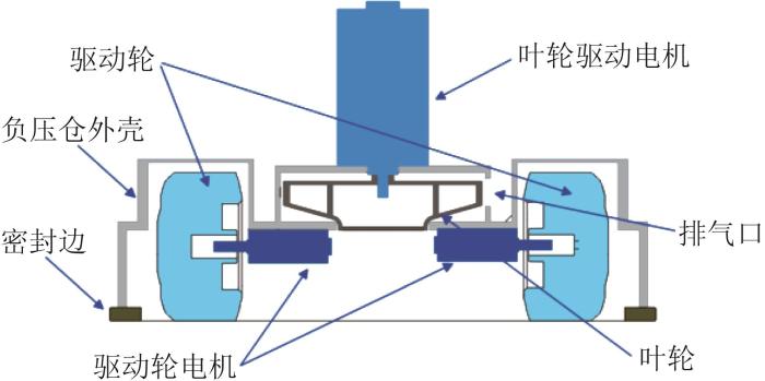 考虑负压吸附的合理性,将叶轮放置在吸附装置的中心位置;高速直流电机倒置固定在叶轮架上,与叶轮相连;2个驱动轮对称布置在负压仓内部。负压吸附装置的结构如图3所示。