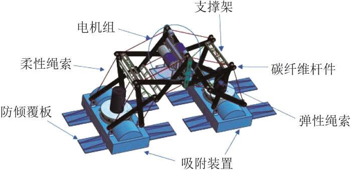 然而,现有的大部分可变形移动机器人可实现的功能较为单一,难以集成多种功能,且其控制系统较为复杂。为此,需要寻找一种控制简单、可变形程度高的结构。张拉整体结构是由一组不连续的受压构件和一组连续的受拉单元组成的能够自支撑的空间网格结构[7],具有可折展、结构自应力平衡、刚度随预应力而变化等优点。仅控制弹性绳索即可实现结构不同位姿的变化,控制相对简单。已有学者对张拉整体机器人进行了研究[7-11]。现有张拉整体机器人的应用环境相对单一,其难以满足在高危环境中移动的要求。为此,本文结合负压吸附装置,提出了一种基于张拉整体结构的可变形移动机器人。将张拉整体结构与负压吸附装置相结合,并利用轮驱动实现机器人平面移动越障、水平墙面过渡、竖直墙面爬行及穿越狭小空间等多种功能,可使张拉整体机器人在多复杂场景下移动,扩大其应用范围。