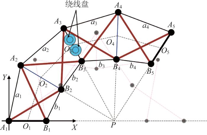 机器人由双层张拉整体结构构成,且为对称布局,其简化构型如图6所示。简化后,构型尺寸不变,且运动与原模型一致。以构型图中机器人机架节点A1为原点,建立平面直角坐标系A1-XY,X方向为水平向右,Y方向为竖直向上,Oi (i=1, 2, …, 5)分别为AiBi 的中点。在此基础上,机器人的运动位姿可由坐标点O5表示。