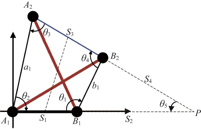 机器人简化单元如图7所示,分析四边形A1B1B2A2及其与延长线交点P之间的几何关系。图中:A1B1为机器人机架,长度为s1,为定值;A2B2的长度为s3;s2、s4分别为点B1、B2到P的距离;A1B2、A2B1为机器人结构杆,其长度均为d。