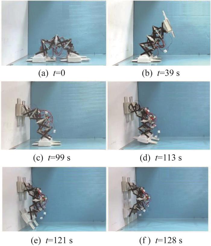 机器人从水平地面攀爬到竖直墙面的实验如图11所示。实验中,地面为亚克力板平面,墙面为白色乳胶漆壁面,机器人左侧足距墙面105 mm。机器人整体攀爬过程与步态规划一致,可顺利完成过渡步态。