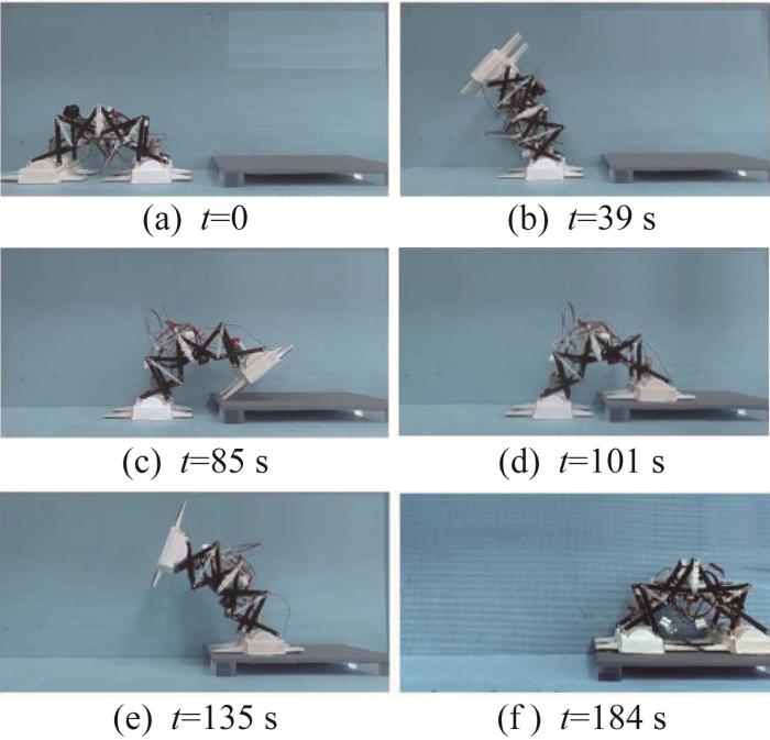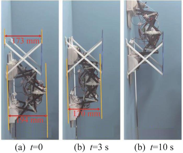 机器人从竖直墙面穿越狭小空间的实验如图12所示。实验中,墙面为普通蓝色壁纸面,狭小空间的高度为173 mm,机器人顶端高度为194 mm。机器人整体穿越过程与步态规划一致,可顺利通过墙面狭小空间。