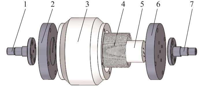 1—左轴;2—左磁极块;3—尼龙套;4—线圈;5—铝镍钴永磁体;6—右磁极块;7—右轴。