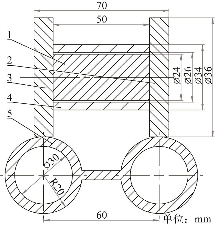 1—LNG52永磁体;2—右磁极块;3—左磁极块;4—线圈;5—水冷壁管。