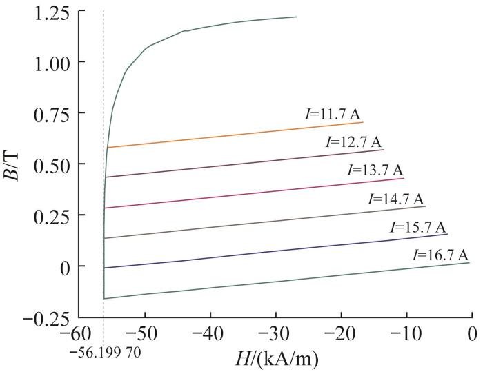 正如图7(b)所示,退磁就是使永磁体工作点处的磁场强度为Hcr。由于并不知道Hcr的值,只知道Hcr略大于Hc,可以先用Hc替代Hcr来求出一个退磁电流,然后以该电流为参考,设置一组退磁电流进行仿真,得出使电永磁轮的吸力最小的电流值即可。在3.1节中已经求得永磁体中心点处B=1.21 T,H=-27.80 kA/m,而Hc=-56 kA/m,故需添加的反向外磁场强度为28.2 kA/m,由