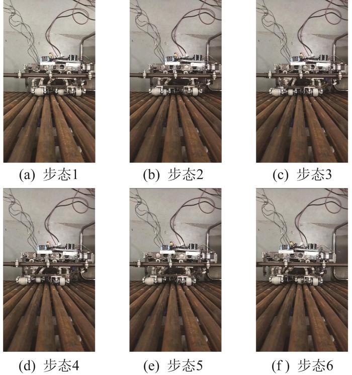 机器人行走过程如图22所示。机器人完成1个爬行周期需执行6个步态。步态1:内腿支撑,外腿抬腿完成,为机器人初始状态,即4个电机处于回零状态,此时内腿上的电永磁轮吸附在壁面上。步态2:内腿支撑行走,外腿前移。步态3:外腿落腿完成,内腿抬腿开始,外腿上的电永磁轮瞬间充磁,外腿吸附在壁面上,内腿上的电永磁轮瞬间退磁,内腿开始脱离壁面,从而保证机器人在行走时一直吸附在壁面上。为了保证外腿落腿时稳定、无冲击,采用了反向落腿的方式。结合图4来说明反向落腿的具体过程:内腿支撑时机器人以速度v向前运动,当滑块3和4前移至距右轴承座10 mm时速度降为0,然后滑块4以速度v相对于机器人框架向后运动,滑块3向后先作加速运动、后作减速运动,当滑块3的速度降为v时,滑块3和4刚好满足落腿所需的位移差的要求,从而完成落腿,这样外腿落腿时相对于壁面的速度为0,从而实现稳定落腿。步态4:外腿支撑行走,内腿抬腿完成。步态5:外腿支撑行走,内腿前移。步态6:内腿反向落腿完成,外腿抬腿开始,内腿上的电永磁轮瞬间充磁,外腿上的电永磁轮瞬间退磁。步态1至步态6构成了机器人步态的一个周期。在整个实验过程中,没有出现机器人从壁面脱离的情况,也没有出现机器人在抬腿和前移的过程中出现卡顿的情况,机器人内、外腿能够协同动作,实现了稳定吸附和灵活运动。机器人的步距是管间距的整数倍,能够始终保证机器人落腿后行走在2根水冷壁管之上,实现了图6所示的行走方案。实验完成后,对电永磁轮退磁,可以很方便地将机器人从壁面分离。另外,由于机器人内框架的限制,机器人内腿的行程比外腿行程短。