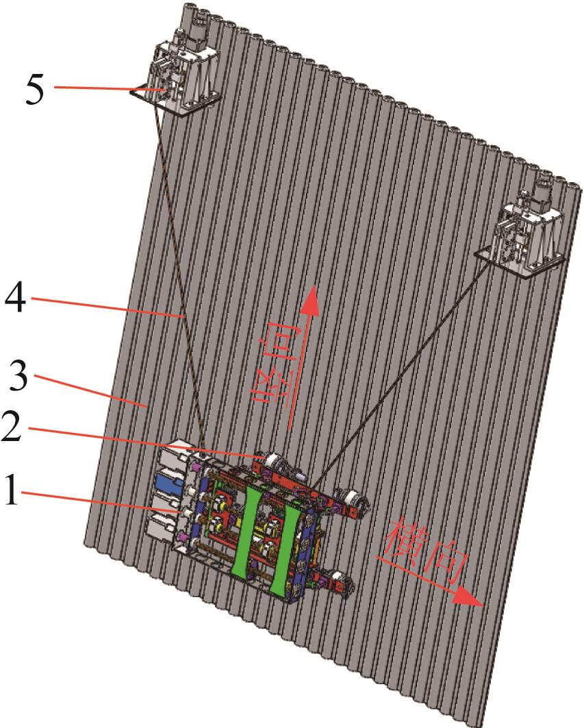 | 图1 机器人工作方案示意1—机器人本体;2—电永磁轮;3—水冷壁面;4—绳索;5—吊绳机构。 |