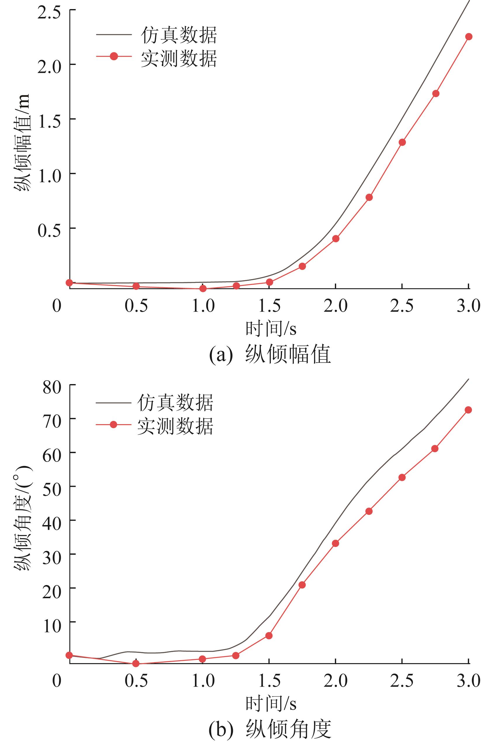 | 图4 欠驱动型ROV纵倾幅值、纵倾角度的实测值与仿真值对比 |