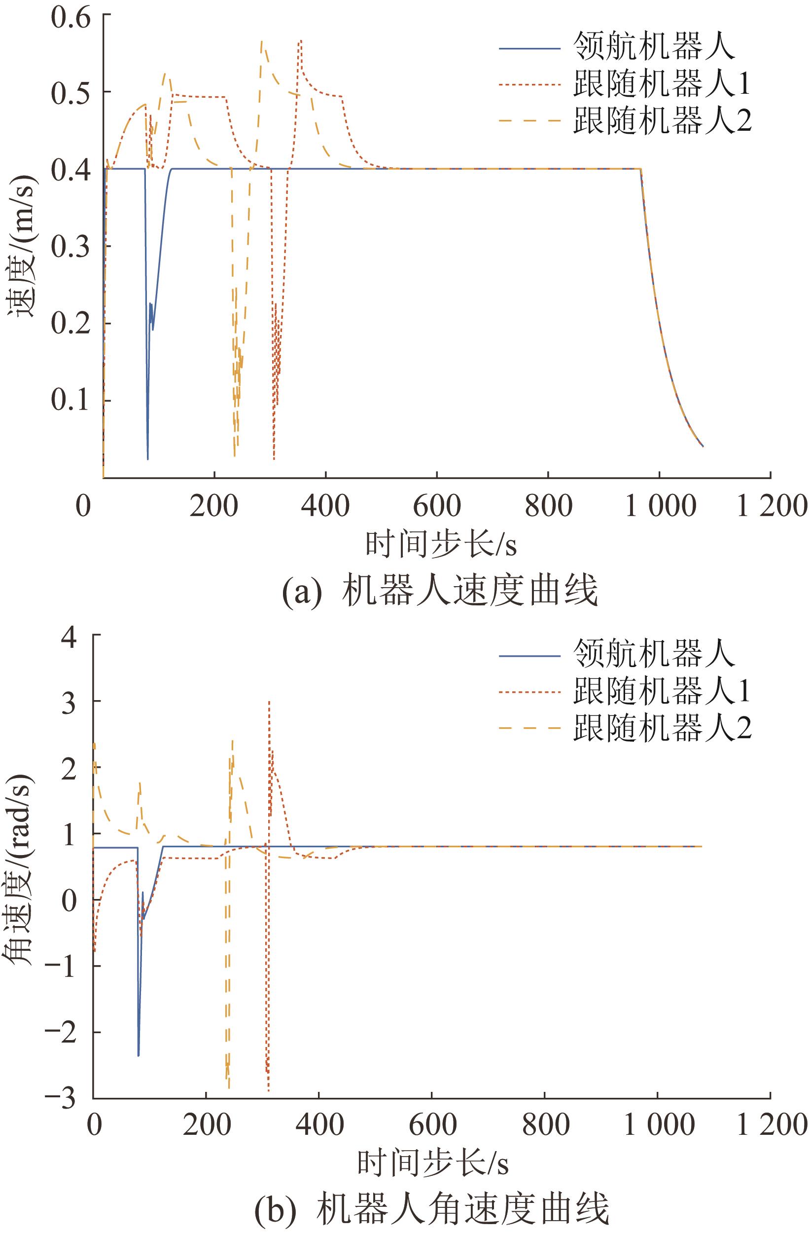 | 图8 环卫机器人编队避障时的速度和角速度曲线 |
