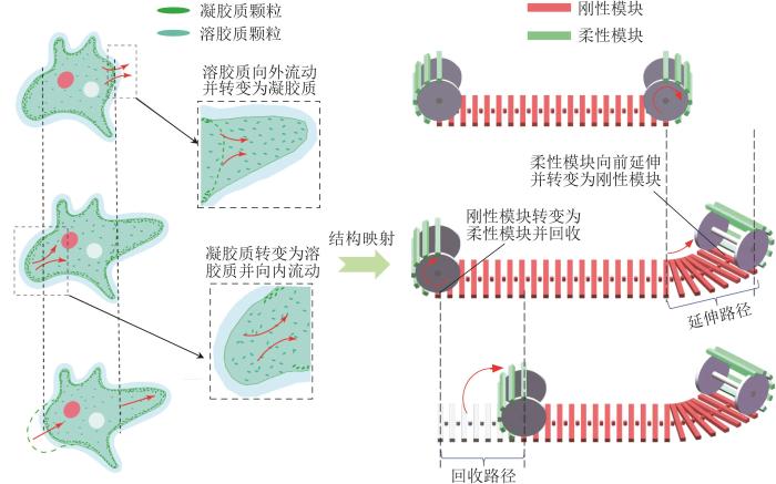 变形虫是一种微小的单细胞生物,其利用胞质颗粒的重组,可实现灵活变形。胞质颗粒存在凝胶和溶胶两种模态,且模态之间能相互转换。变形虫的外部支撑层由许多刚性的凝胶质颗粒构成,而内部身体则由大量液态的溶胶质颗粒组成,其结构组成如图1所示。区别于大多数爬行生物躯干蠕动或足式摆动的运动方式,变形虫通过伪足生长的方式来实现延伸运动,表现出极强的变形能力。具体为:内部的溶胶质颗粒不断向外流动并转换为凝胶质,实现尖端外翻并生成伪足,以向前延长身体;同时,后端的凝胶质颗粒转换为溶胶质并向内流动,实现身体后部的收缩;当完成收缩运动后,外侧的溶胶质颗粒重新转换为凝胶质,以使身体形态保持稳定。基于大量胞质颗粒的位置重组和模态转换,变形虫可随时重构自身形态,实现沿任意方向的运动与灵活变形,这为可重构机器人的设计提供了一种新的灵感。