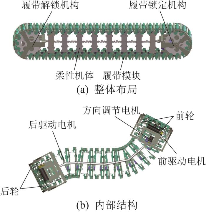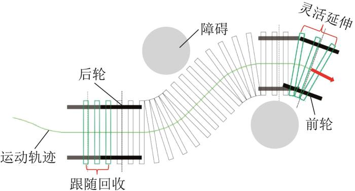 所设计的机器人采用可三维弯曲的单履带链环作为行走机构,由独立的前轮和后轮共同驱动前进。基于履带的可锁定设计,机器人前进时通过头部依次调整并锁定履带模块的偏航关节角,以将底部履带构建为刚性的支撑路径,从而决定前进方向;尾部在跟随的同时解锁各个关节,以回收该路径,从而使机器人实现连续滚动。通过依次选取不同的关节锁定角,可生成特定形状的路径。此外,由于内部机体完全柔性,机器人可在前进过程中被动适应所生成路径的形状,从而实现重构变形。