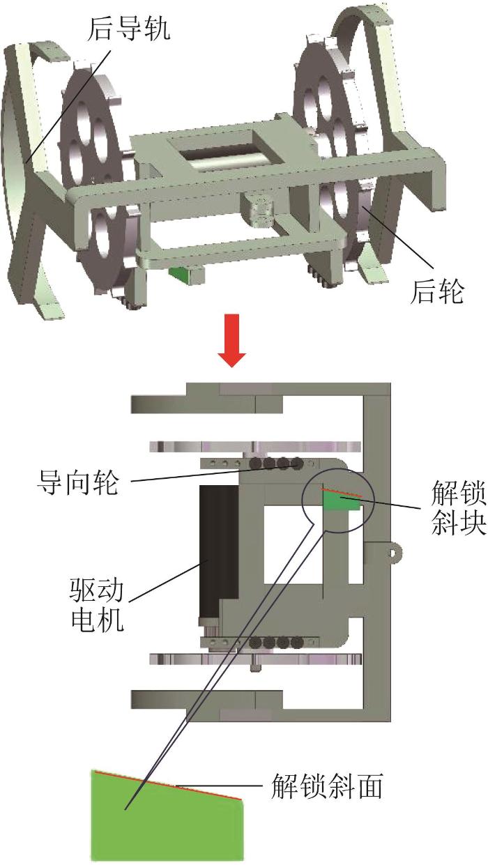 履带解锁机构位于机器人尾部,主要包括后轮、驱动电机、解锁斜块、导向轮和后导轨,如图7所示。该机构能被动解锁履带的偏航自由度,并引导履带与后轮平顺啮合,以持续提供新的自由履带。在后轮的驱动下,解锁斜面可推动锁定销回到初始位置,使得锁定销与半齿分离,从而使偏航关节解锁为自由状态。