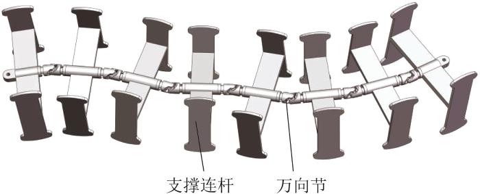 柔性机体由万向节铰接的多个支撑连杆串联组成,其可自由摆动的柔性构型能够被动适应刚性履带的多样化变形,如图8所示。无论是在平地行驶还是在被动适应崎岖地形时,柔性机体均能支撑顶部松散的履带,以避免其与底部履带发生干涉,从而保障机器人平顺运行。