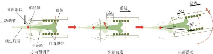 当机器人转向时,偏航关节的角度调整过程包括方向预调整、头部前进和头部摆动三步,如图9所示。其中:方向预调整为方向调节电机推动导向滑块向左或向右移动,以便后续导向滑块的斜面引导前侧自由履带摆动。当机器人头部前进后,导向滑块斜面将与后侧锁定履带的引导轮接触。随着头部继续前进,导向滑块斜面与引导轮之间的接触力使头部发生摆动,并带动自由履带沿偏航关节旋转。