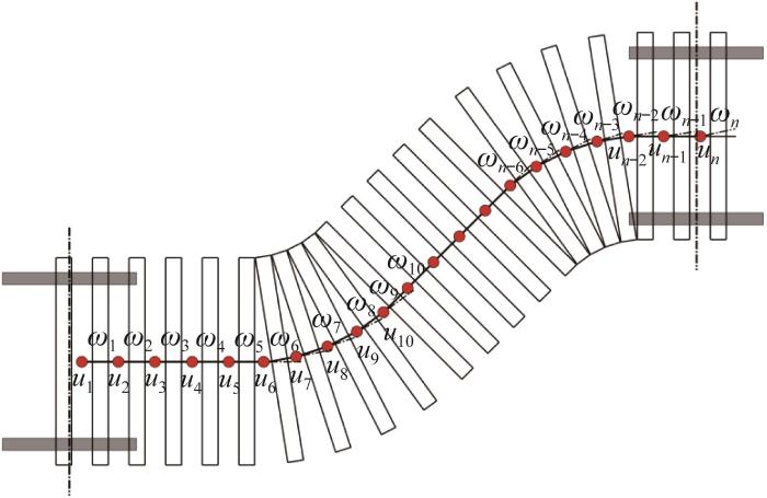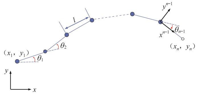 基于上述重构运动原理,机器人可沿由底部锁定履带构建的路径前进,故底部履带的位置与关节角直接决定了机器人的位置状态。在平面运动中,底部履带可视为由关节连接的多连杆串联系统,如图12所示。