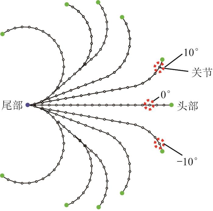 在机器人头部锁定机构对履带关节角进行调整与锁定的同时,尾部解锁机构对关节进行解锁,以保证机器人连续运行。由于底部的履带始终为刚性状态,可作为支撑路径引导机器人前进,因此头部向前不断放置新的履带链节,即可实现路径延伸,而尾部可同步回收底部履带以实现路径裁剪。基于头部锁定与尾部解锁的配合,机器人可沿履带所构建的路径不断前进。通过组合不同数量的偏航关节(偏转10°或-10°),机器人能够在前进过程中随时调整头部的延伸方向,生成多样化的曲线路径,且任意部位严格跟随,整体运动轨迹呈高度一致性,适用于蜿蜒曲折的狭窄空间。机器人的重构运动原理如图11所示。