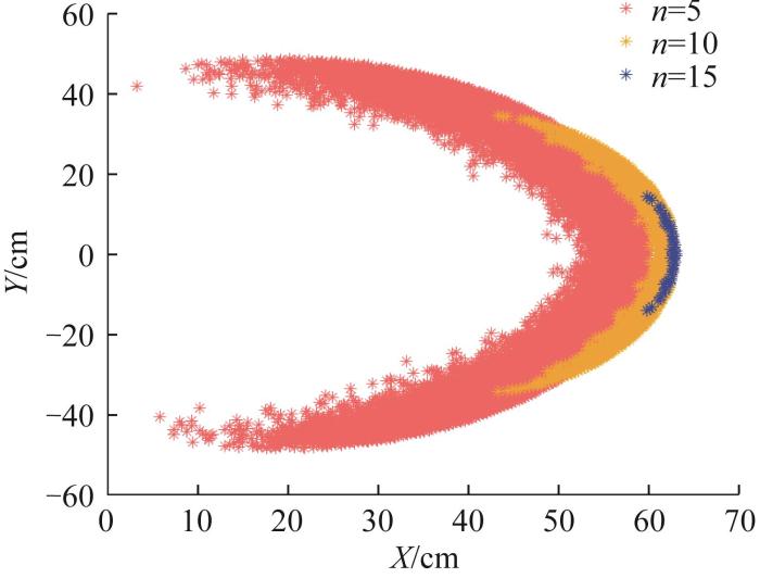 为方便表示,隐藏机体位置,仅用头部可达空间表示机器人的形态变化范围,并将其作为灵活性指标。因受限于固定的关节锁定角,履带模块的数量直接影响机器人的灵活性。基于此,利用MATLAB软件开展仿真模拟,分析底部履带模块数量与头部可达空间之间的关系。在机器人总长度(60 cm)的约束条件下,考虑设计尺寸的限制,底部履带模块数量最多取20个,本文分别选取5,10,20个履带模块并计算任意形态下的头部位置,从而得到头部可达空间,结果如图16所示。
