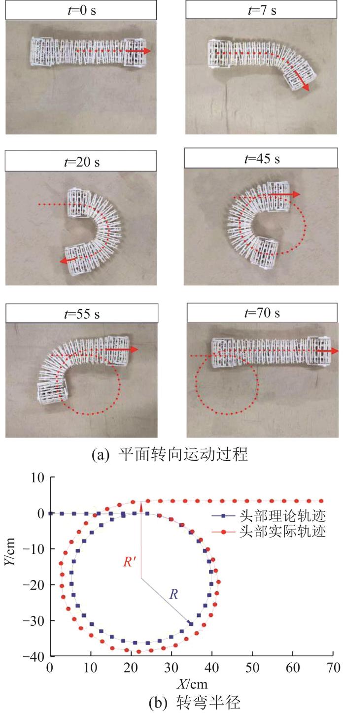 通常情况下,狭窄障碍空间下机器人的通过性受到转弯半径的制约。基于上述分析,履带偏航关节连续弯曲时,机器人能够以最小曲率半径实现转向,则其最小转弯半径R可表示为: