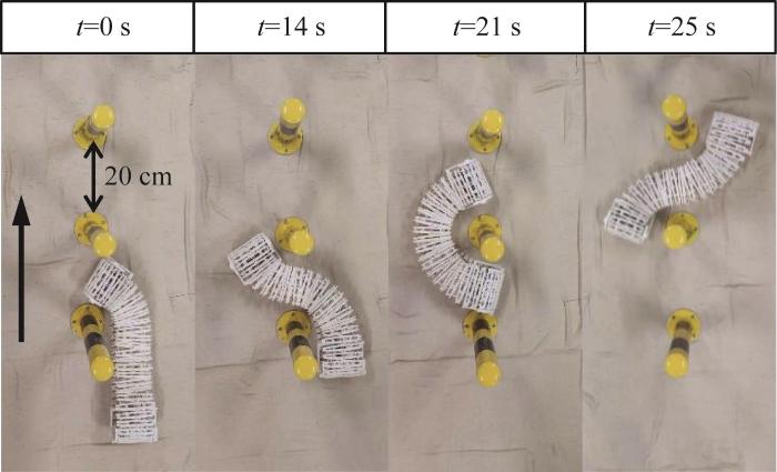 履带的偏航关节具有3种锁定角,通过机器人头部依次选取不同的锁定角并将偏航关节锁定,则底部履带可构建出一条蜿蜒的路径,以引导机器人实现避障运动。为了测试机器人在狭窄环境下的避障性能,在地面上布置3个相距20 cm的障碍,开展机器人避障实验,如图18所示。结果表明,机器人可沿底部履带构建的路径前进以实现灵活避障,验证了机器人在狭窄空间中的通过能力。