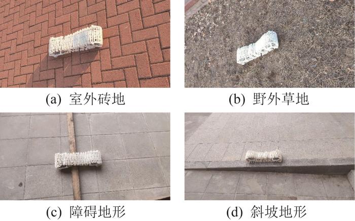 履带的俯仰关节可自由摆动,能够根据地形被动调整其俯仰角,从而使机器人具备一定的地形自适应能力。为验证机器人的自适应性能,在室外砖地、野外草地、障碍地形、斜坡地形下分别开展通过性测试实验,如图19所示。实验结果表明,配合俯仰关节的被动适应,该机器人具备良好的自适应能力,可穿越各类崎岖地形。