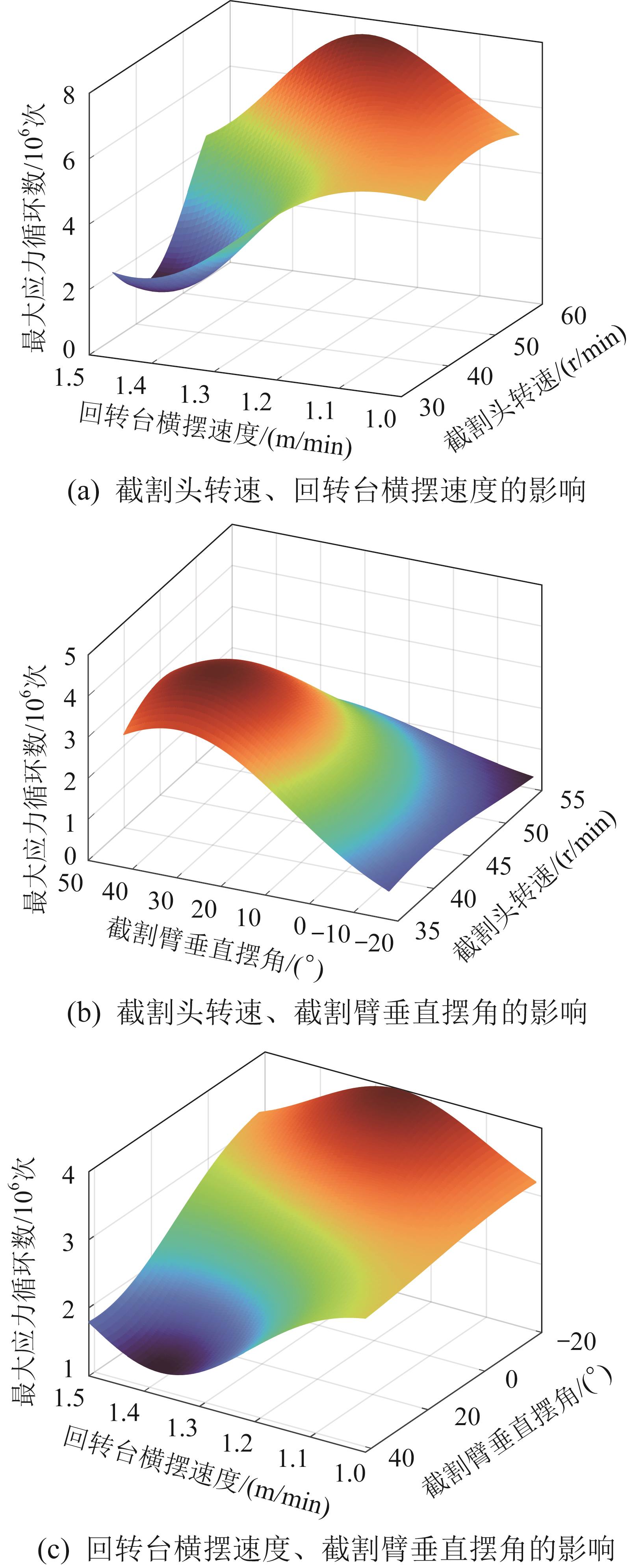 | 图11 掘进机服役参数对回转台疲劳寿命影响的响应面 |
