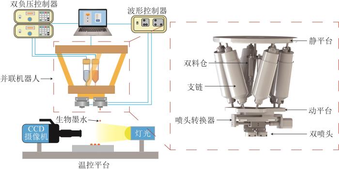 供料模块为打印系统提供打印所需的生物墨水,其稳定性会直接影响打印的成形精度。供料模块由负压泵、双负压控制器、双料仓、软管回路等组成。将负压泵作为动力源,来精准提供稳定且可调节的负压吸力;配备了双负压控制器,其通过双通道独立调控2个料仓的吸力,对吸力大小进行精细化、动态化控制,确保在不同打印阶段和不同材料特性下均能提供较精确的补料驱动力。在打印过程中,依据预设参数及实时反馈,补料系统会自动、持续且精准地进行补料,保障打印过程的连续性与稳定性。此外,作者创新性地将2个料仓布局于并联机器人的中心位置。这一设计不仅避免了料仓对打印头运动轨迹及打印作业空间的干扰,确保打印作业的精准、高效,而且通过优化料仓与打印喷头的相对位置关系,有效缩短了墨水输送路径,减少了墨水在输送过程中的残留与浪费,从而减少了生物墨水的整体消耗量,实现了高效打印与节约资源双重目标。