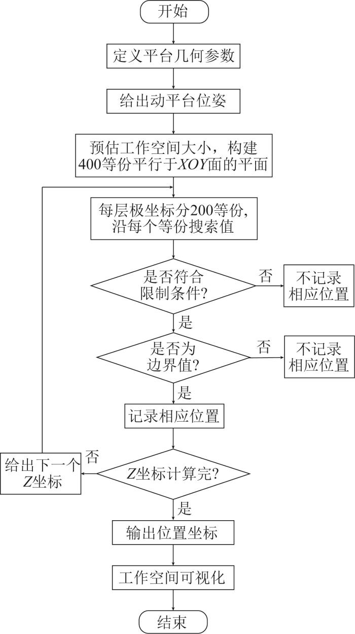 首先,定义平台的几何参数,包括静、动平台的铰链所在位置,支链的最大、最小长度,静、动平台相对高度,滚动角、俯仰角的最大和最小值,并通过给定的滚动角、俯仰角实现机器人动平台翻转角度的固定。其次,预估机器人运动空间在X、Y、Z向的运动范围,并将Z向的运动范围分割为400等份,构建400个平行于XOY面的平面,再将这些分割的平面按极坐标分割200等份射线,沿每个等分射线搜索满足条件的边界值。最后,判断每层极坐标上的搜索值是否满足机器人支链长度、铰链转角以及支链间干涉等约束条件。