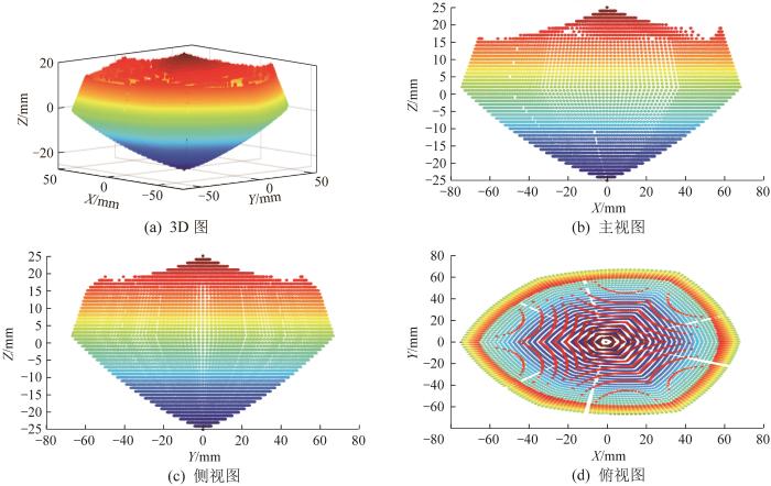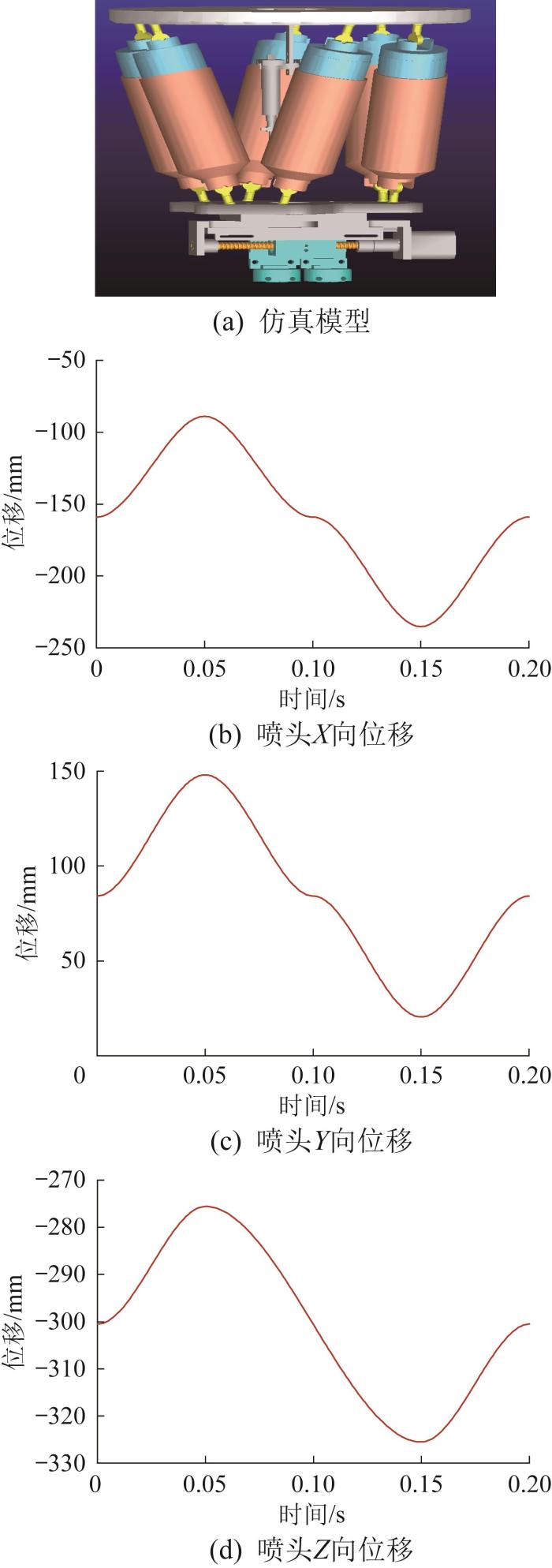 为了验证上述通过求解运动学逆解得到的打印系统工作空间的准确性和可靠性,进行打印系统打印仿真。通过ADAMS软件建立与实际系统相同的模型,如图7(a)所示,进行运动学正解分析。设置各结构的材料属性为steel;添加静平台与大地的固定副,保证静平台水平、稳定;添加支链与静、动平台之间的虎克铰链,实现支链与静、动支平台之间的连接;添加铰链旋转轴,以实现各支链一定角度的自转;添加支链圆柱形平移副,以实现支链的伸长与收缩;通过step函数分别控制6条支链的伸长与收缩,添加伸长或收缩的时间和伸长量;添加接触刚度系数,判断运动过程中是否有接触碰撞问题。通过测量喷头移动距离,在后处理模块中输出打印系统的工作范围,如图7(b)至图7(d)所示。